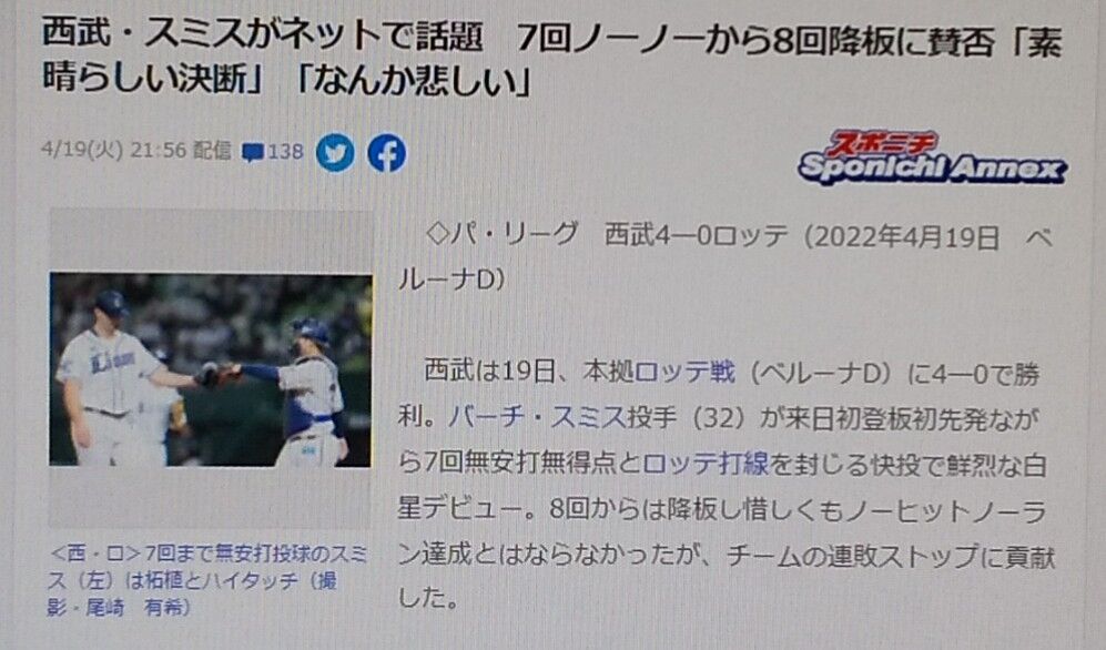 (2022年4月19日:スポニチ配信記事にて)