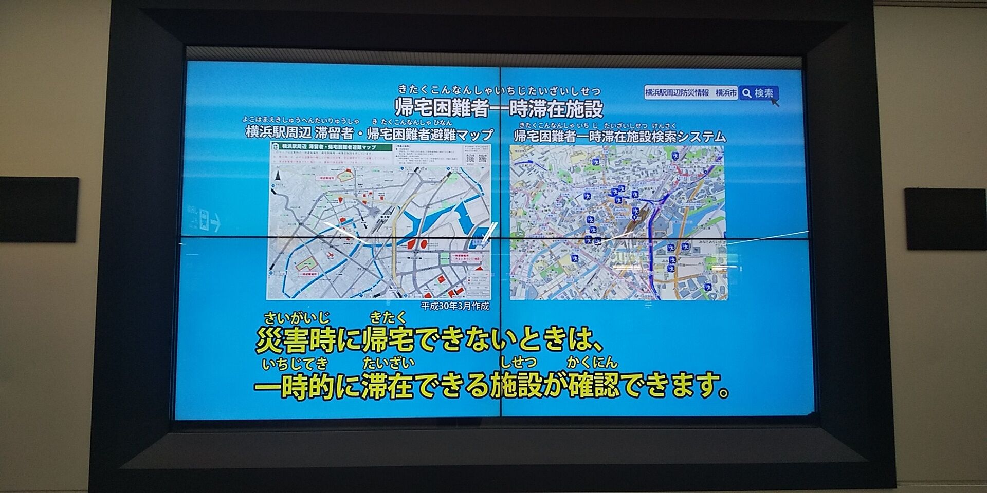 JR横浜駅北改札では、災害時徒歩帰宅ステーションの場所が案内されています。