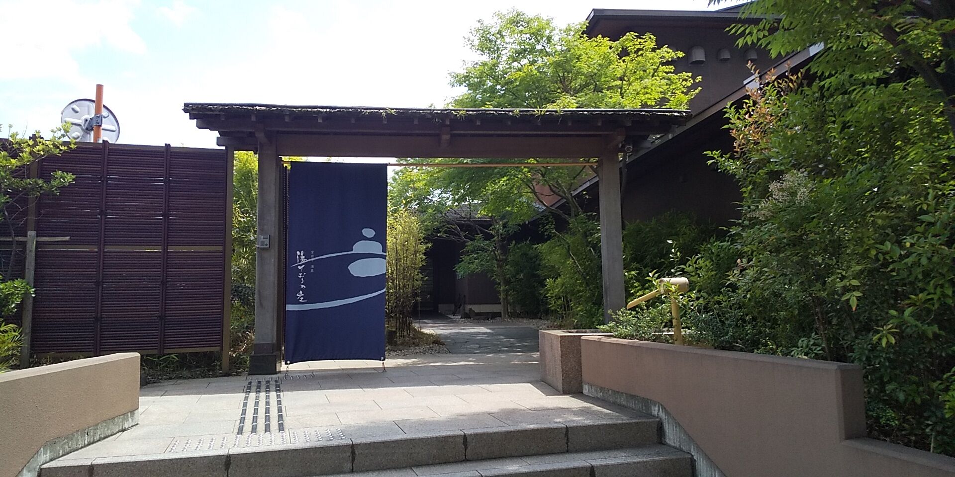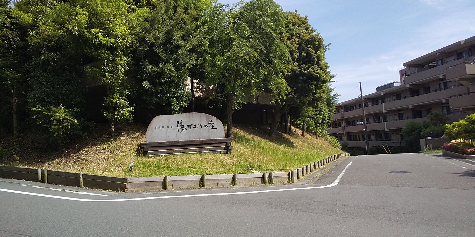 そして上り坂を歩くと、温浴施設「宮前平源泉湯けむりの庄」が見えてきます。