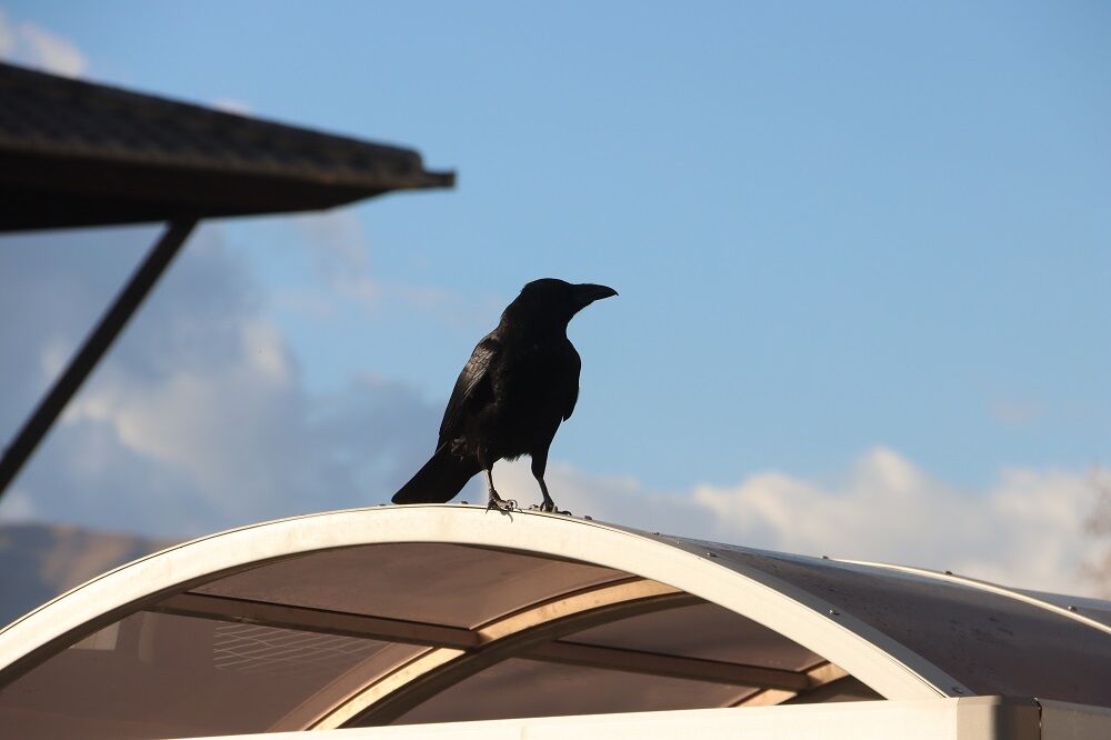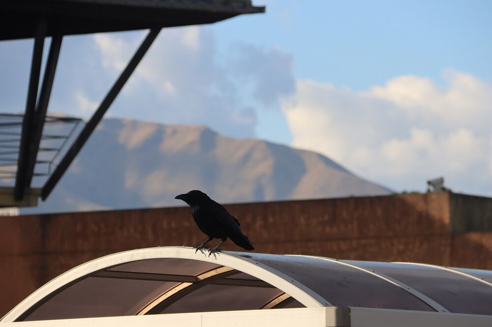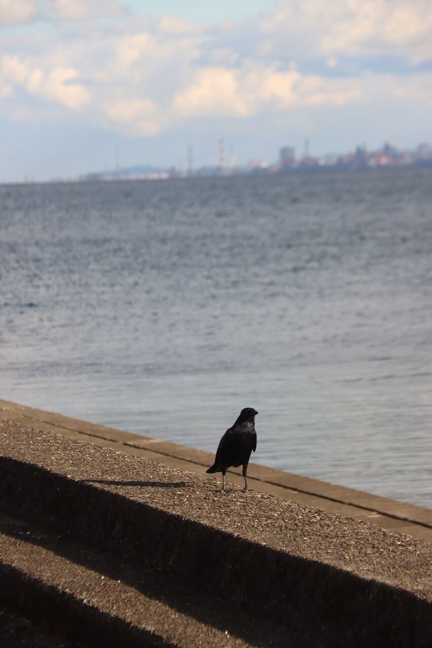 大分県別府市の別府北浜にあるスパビーチで海を眺めていたら、カラスも岸壁や傍にある市営温泉「テルマス」の屋外健康浴場の屋根の上から我々人間と同じように海の方を眺めていました。