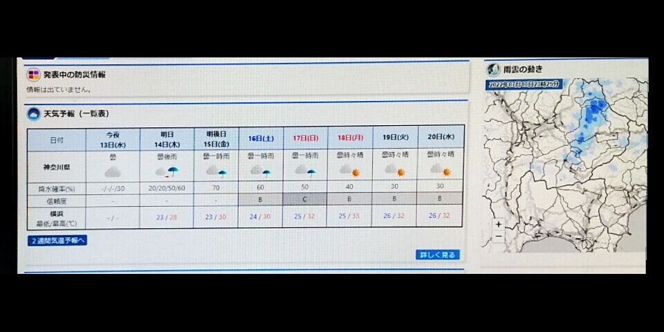 神奈川県の週間予報を見ると今週17日(日)までは曇りや雨ベースの日が多くなるようです。