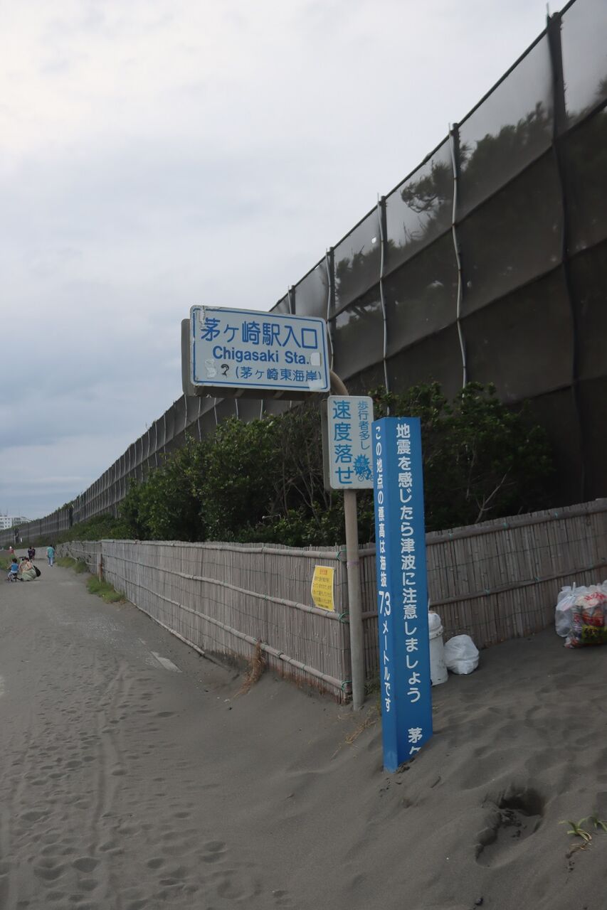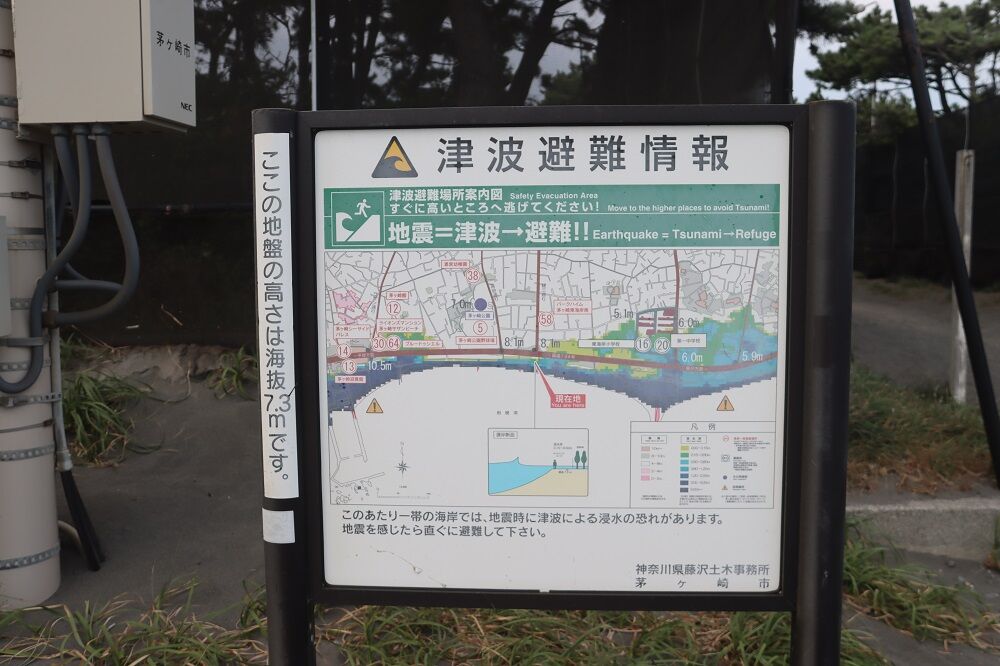 写真はサザンビーチちがさきから眺めた相模湾と海岸付近の掲示版です。