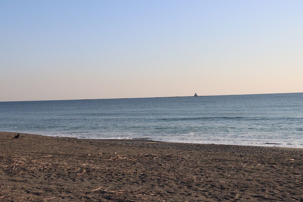 沖には烏帽子岩が見え、砂浜からハシボソガラスがじっと相模湾を眺めています。