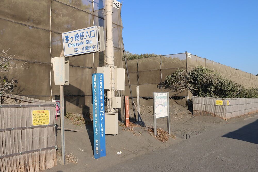 この場所の標高は海抜7.3mとのことで地震や津波に関する注意の看板や、"津波避難情報"の看板が掲示されています。