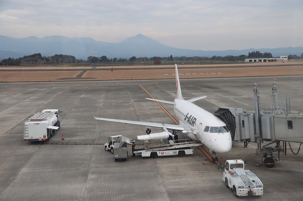 鹿児島空港の飛行機と霧島連山という光景。