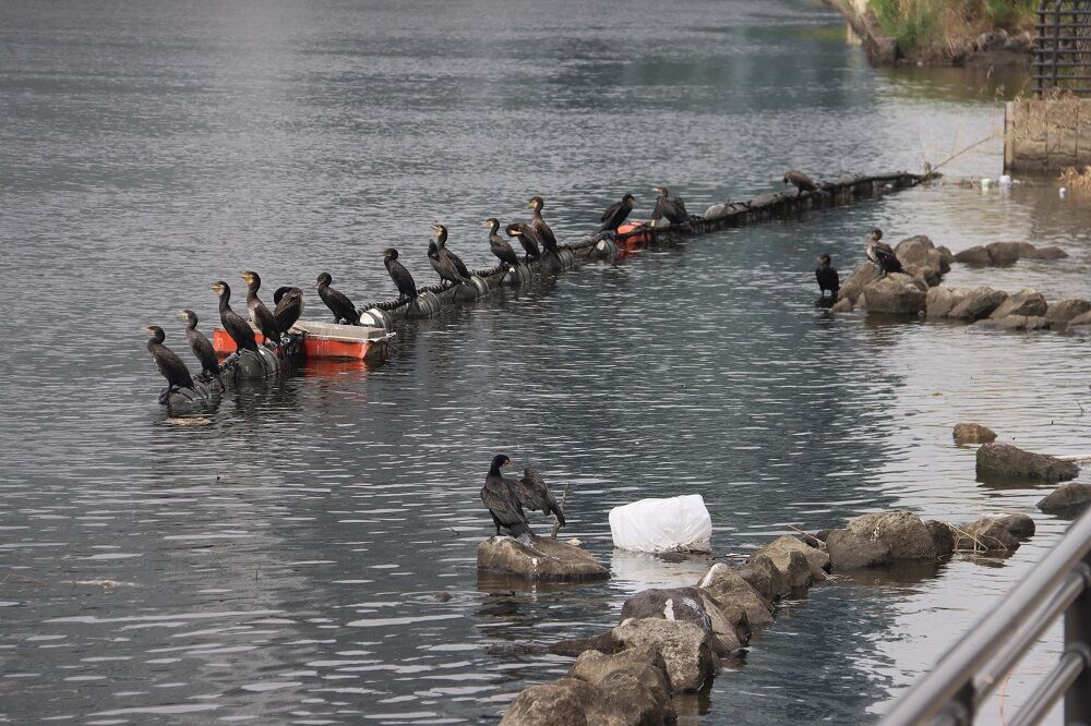 20羽以上のカワウの集団が、川を挟んで反対側にあるポートサイド地区のマンション群を眺めながらゆっくり過ごしていました。