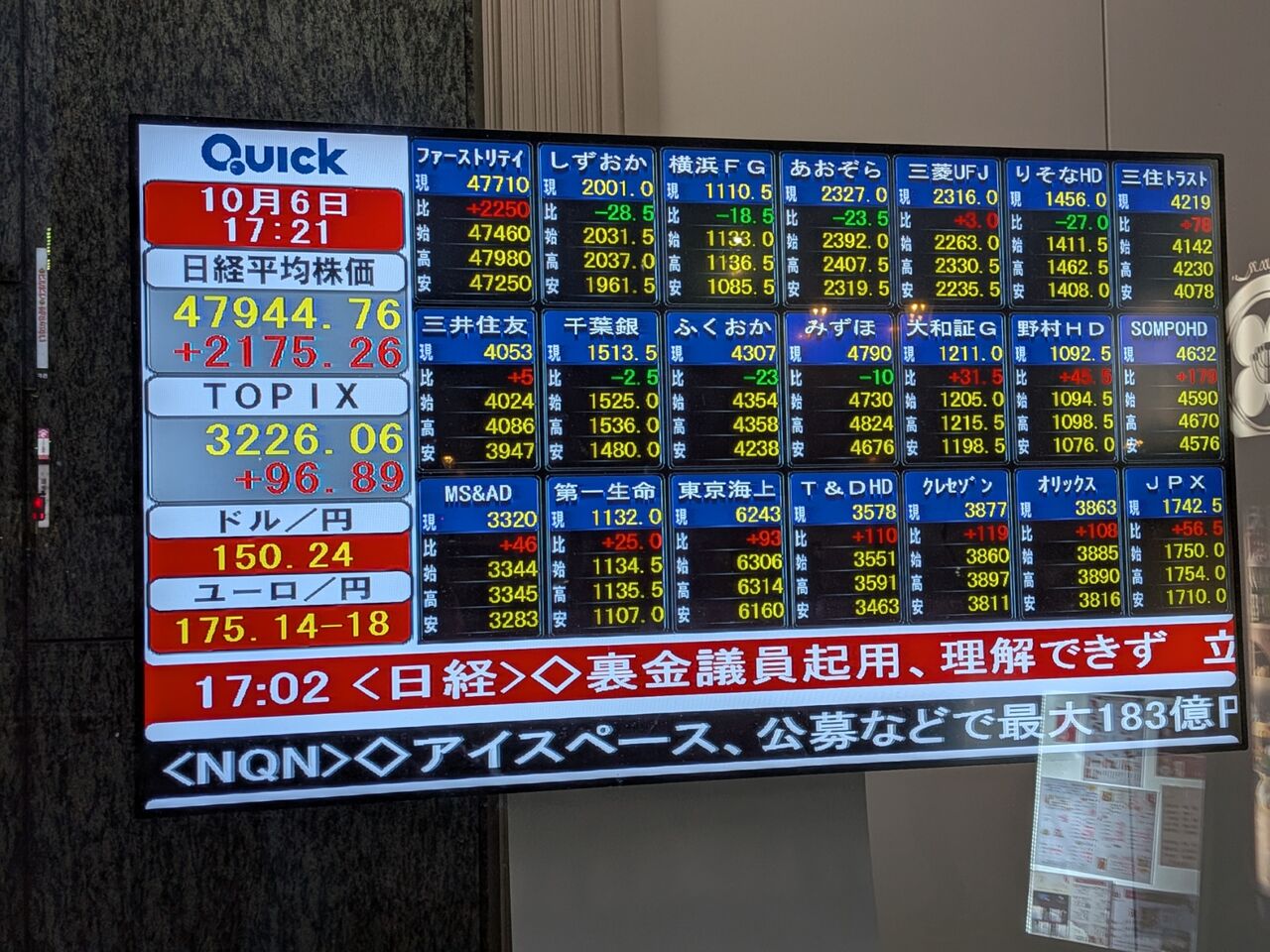一昨日7日の取引時間帯には一時、4万8527円の史上最高値を記録しましたが・・・。