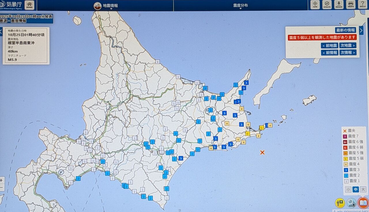 昨日10月25日1時40分頃、北海道・道東地方で強い地震がありました。
