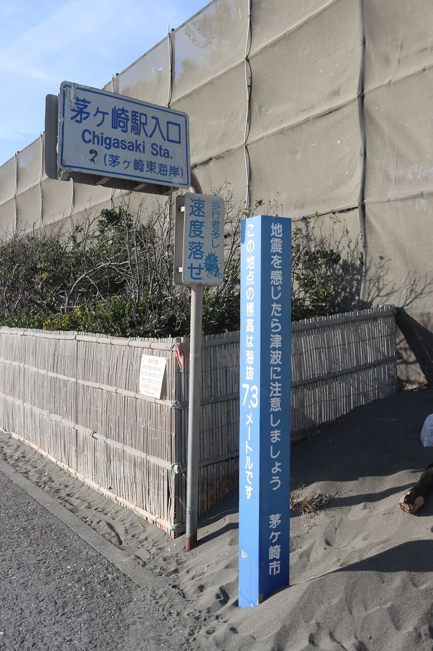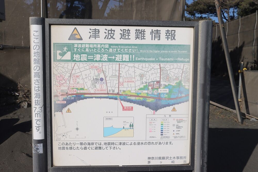 この場所の標高は海抜7.3mとのことで地震や津波に関する注意の看板や、"津波避難情報"の看板が掲示されています。