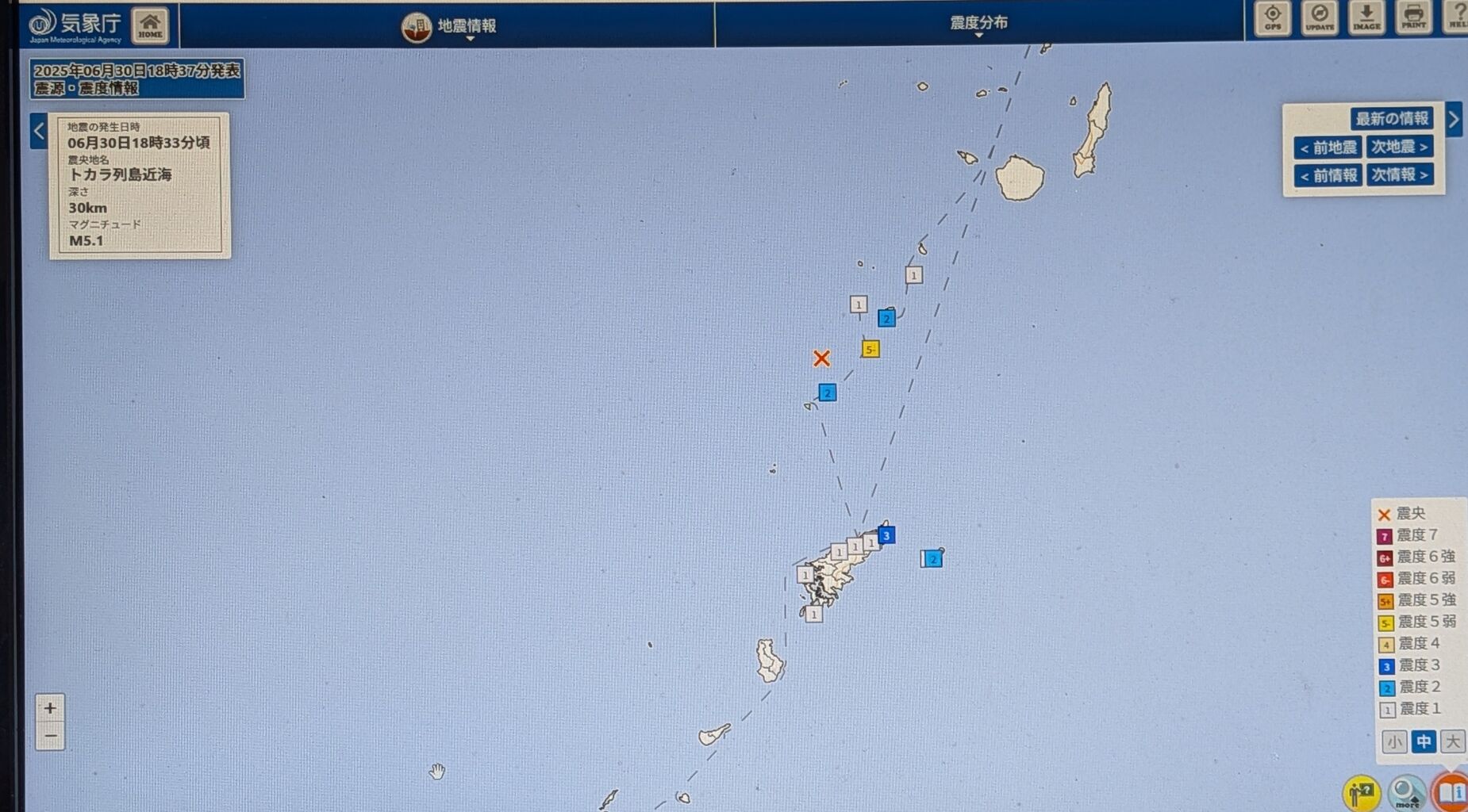 同日18時33分にトカラ列島近海を震源とするマグニチュード5.1の地震で、震度5弱の強い揺れを悪石島で観測しています。